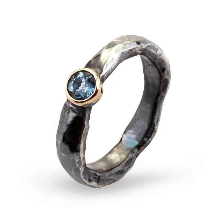 Ringen er lavet i sterling sølv med 14 karat guld og aquamarin.