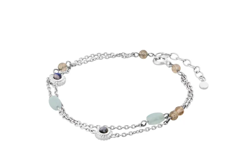 Armbåndet er fremstillet i sterling sølv med rainbow månesten, labradorit og akvamarin.