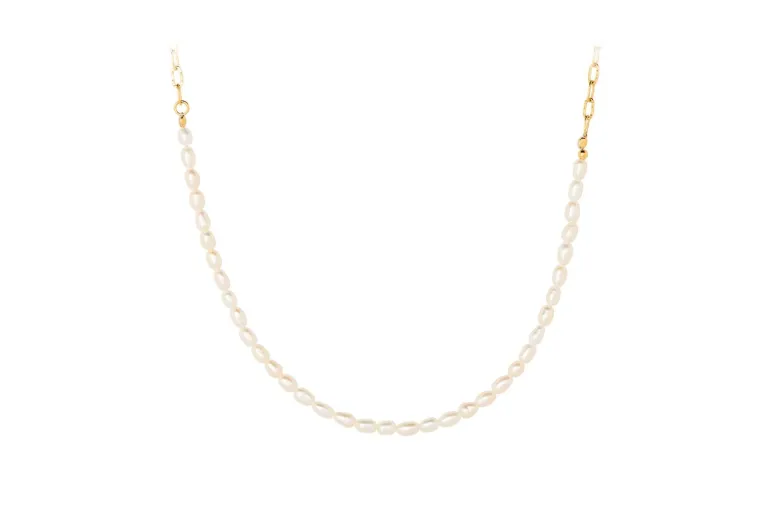 Denne moderne halskæde er lavet i forgyldt sølv med ferskvandsperler.